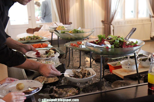 Alkupalat sai hakea noutopöydästä, jossa olikin kauniisti tarjolla monenlaista kalaa, lihaa, salattia, pateeta ja prässättyä lihaa.